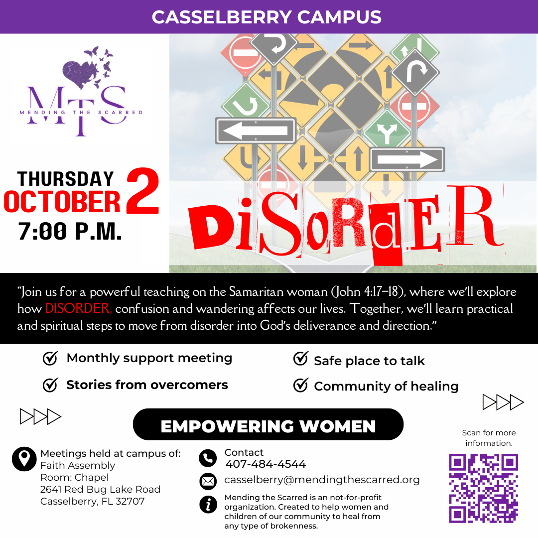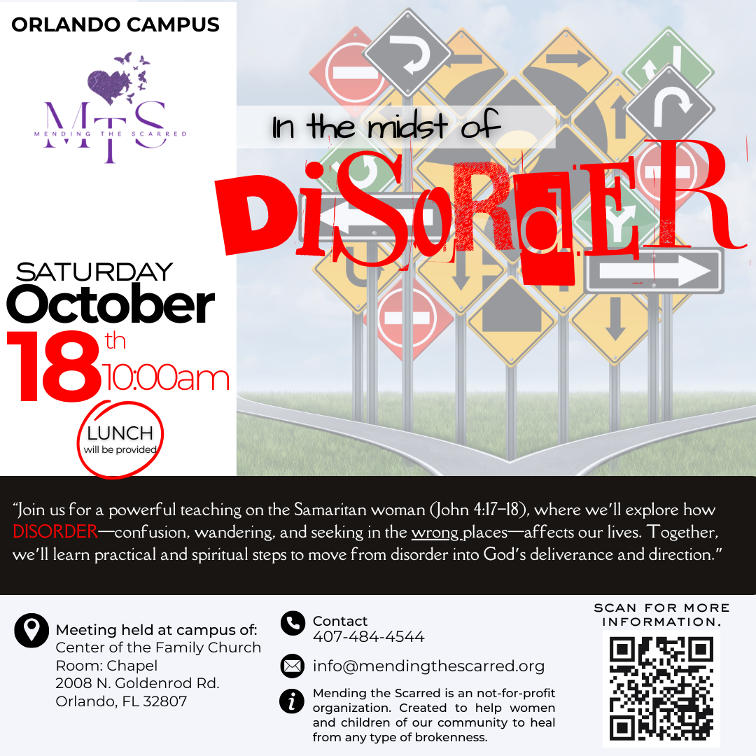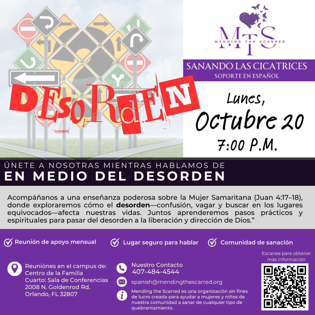 One Theme, Many Hearts Each month, our English and Spanish chapters in Orlando share the same monthly theme—each in their own time and space. These gatherings spark reflection, conversation, and connection. Every chapter provides a flyer with meeting details, and our Spanish-speaking community has a dedicated group offering the message fully in Spanish. Wherever you join, you’ll find belonging, growth, and encouragement for the journey. This Month’s Topic: In the Midst of Disorder Life can feel messy and confusing—like too many signs pointing in different directions. This month we’ll look at the Samaritan woman’s story (John 4:17–18) and talk honestly about how disorder shows up in our own lives. Together we’ll learn simple, faith-filled ways to find God’s clarity and direction.